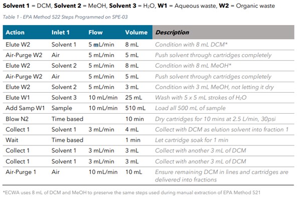 추출은 EPA Method 522를 따라 진행되었고 SPE-03은 아래와 같이 프로그램 되었습니다.