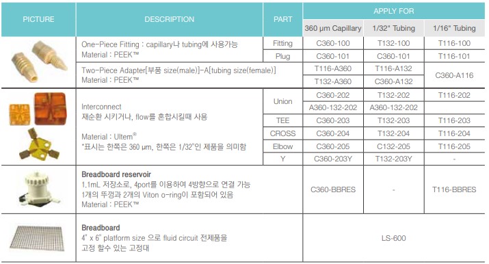 l 1/32”OD, 1/16”OD 또는 360um OD 적용 인터페이스