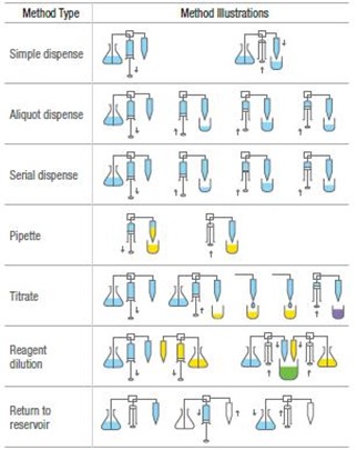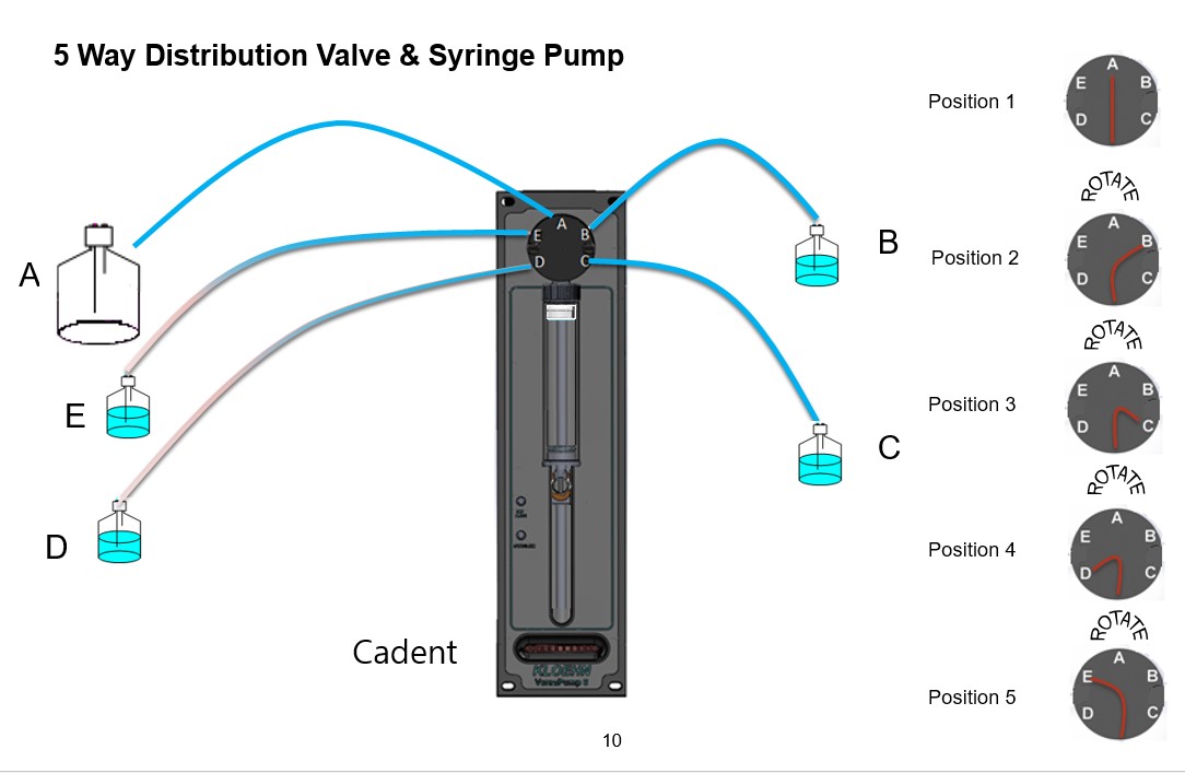 그림에서처럼 5way distribution 밸브와 cadent 펌프를 프로그래밍으로 제어함으로써 외부 공급원으로부터 유체를 흡입하고 밸브의 회전 타이밍에 맞춰 각각의 목적 용기에 자동 분주 할 수 있습니다.